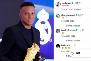 體育資訊11月1日訊 由于上賽季的出色表現(xiàn),皇馬射手姆巴佩奪得職業(yè)生涯首個(gè)歐洲金靴獎。在社交媒體上,法國人發(fā)表了自己的感受,而隊(duì)友貝林厄姆則和他進(jìn)行了互動。