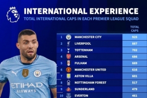 英超各隊(duì)球員為國家隊(duì)出戰(zhàn)場次排名: