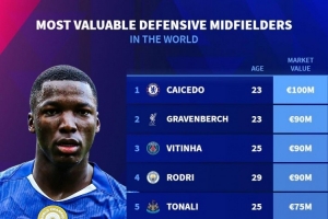 體育資訊11月2日訊 德國轉(zhuǎn)會市場列出了防守型中場身價排名,凱塞多以1億歐居首。