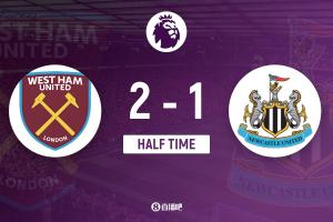 上半場比賽結束,西漢姆聯(lián)2-1紐卡斯爾聯(lián)。