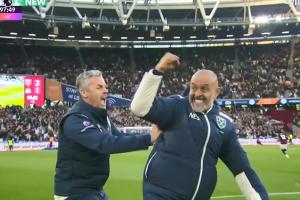 下半場(chǎng)補(bǔ)時(shí)第5分鐘,紹切克補(bǔ)射破門幫助西漢姆鎖定勝局,主帥努諾在場(chǎng)邊與教練組激動(dòng)相擁。