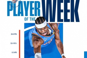 亞歷山大上周率領(lǐng)雷霆取得4勝0負(fù)的戰(zhàn)績(jī),場(chǎng)均拿下28.8分4.5籃板6.5助攻。
