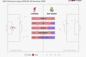 利物浦在本場(chǎng)比賽中將皇馬的預(yù)期進(jìn)球(xG)限制在僅0.45,幾乎沒(méi)有給對(duì)手機(jī)會(huì)。