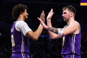 賽后湖人官方曬出本場(chǎng)贏球海報(bào),東契奇和海斯擊掌照登上封面。