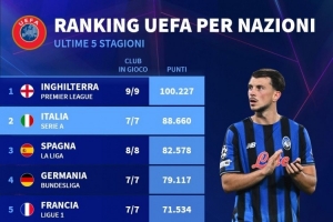 體育資訊11月6日訊 德國轉(zhuǎn)會市場列出了各國聯(lián)賽的歐戰(zhàn)總積分排名,英超居首,意甲、西甲二三位。