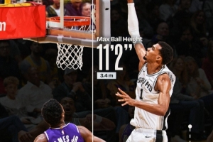 不過在比賽中,他仍有十佳球表現(xiàn)。NBA官方發(fā)布了他隔扣布朗尼一球的兩項數(shù)據(jù),其中球的最高點達(dá)到了3.4米,而文班亞馬這一扣的滑行距離達(dá)到2.2米。