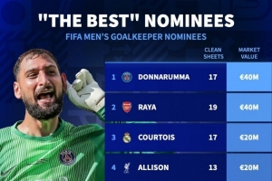 體育資訊11月7日訊 FIFA公布了年度最佳男足門將候選名單,德國轉(zhuǎn)會市場列出了入圍者身價(jià)排名,多納魯馬、拉亞4000萬歐居首。