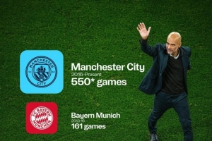 此役將是瓜迪奧拉執(zhí)教生涯帶隊(duì)參加的第1000場比賽,曼城官方社媒曬出瓜帥執(zhí)教場次的分布。