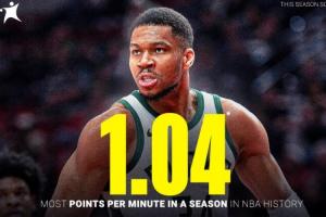 此役過后,雄鹿當家球星揚尼斯·阿德托昆博本賽季場均得分上漲至33.8分,場均出場時間為32.3分鐘,他上場每分鐘能得到1.04分,追平了NBA歷史記錄!