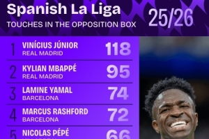 體育資訊11月12日訊 本賽季西甲進(jìn)行了12輪比賽,Squawka統(tǒng)計(jì)了在對方禁區(qū)內(nèi)觸球次數(shù)榜,維尼修斯118次居首,姆巴佩、亞馬爾二三位。