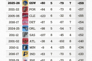 據(jù)統(tǒng)計,勇士本賽季至今12場比賽,主場凈勝對手80分,客場凈負79分,主客場凈勝分差值達到159,創(chuàng)下了本世紀以來所有球隊賽季前12場比賽的最懸殊紀錄。