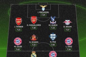 后衛(wèi):廷伯(阿森納)、加布里埃爾(阿森納)、格伊(水晶宮)、勞姆(萊比錫)
