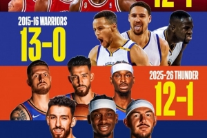 下一篇: 70勝有戲!雷霆前13場12勝1負追平72勝公牛 73勝勇士前13場全勝
