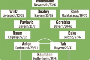 后衛(wèi):勞姆(萊比錫)、安東(多特)、若納坦·塔(拜仁)、巴庫(kù)(萊比錫)