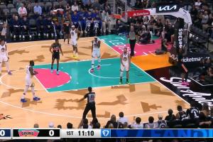 下半場換成了主色調(diào)淺藍(lán)色Curry12的球鞋