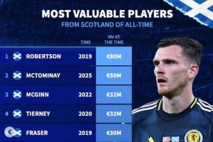 蘇格蘭球員歷史身價:19年羅伯遜8000萬歐第1,今年麥克托米奈第2