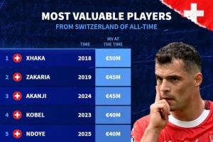 體育資訊11月16日訊 日前,德國(guó)轉(zhuǎn)會(huì)市場(chǎng)統(tǒng)計(jì)了瑞士球員歷史最高身價(jià)排行,扎卡5000萬(wàn)歐居首。
