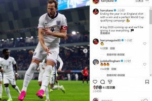凱恩社媒曬出慶祝進球的照片,并寫道:“以一場勝利和完美的世預賽為今年的國家隊征程收官,重要的2026年即將到來,我們將全力以赴?!?/p>