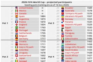 體育資訊11月17日訊 世預賽激戰(zhàn)正酣,目前世界杯48支參賽隊已確定32席,數據機構Football Meets Data根據現(xiàn)有世界排名給出了最新的世界杯分檔預測。