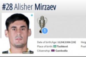 米爾扎耶夫現(xiàn)年29歲,司職中場,2019年1月前往柬埔寨聯(lián)賽毗沙卡FC效力,已為球隊出戰(zhàn)82次,貢獻5球7助攻,德轉(zhuǎn)身價15萬歐。根據(jù)國際足聯(lián)官方消息,米爾扎耶夫的國際足聯(lián)會籍已由烏茲別克斯坦轉(zhuǎn)換為柬埔寨。