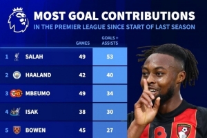 體育資訊11月18日訊 德國(guó)轉(zhuǎn)會(huì)市場(chǎng)統(tǒng)計(jì)了上賽季至今球員在英超參與進(jìn)球的數(shù)量,并列出榜單,薩拉赫53球居首,哈蘭德40球次席,姆伯莫34球第三。