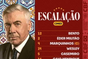 12-本托、2-米利唐、4-馬爾基尼奧斯、14-韋斯利、5-卡塞米羅、16-卡伊奧·恩里克、8-吉馬良斯、21-庫尼亞、20-埃斯特旺、10-羅德里戈、7-維尼修斯