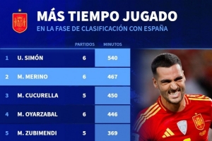體育資訊11月19日訊 德國轉(zhuǎn)會(huì)市場統(tǒng)計(jì)了西班牙球員本屆世預(yù)賽的出場時(shí)間,并列出榜單,門將西蒙540分鐘居首,梅里諾467分鐘非門將球員中最多。