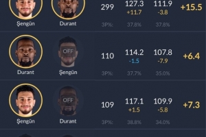 杜蘭特在場而申京不在場時,火箭進(jìn)攻效率114.2,防守效率107.8,凈效率+6.4;