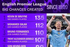 19-20賽季以來英超創(chuàng)造重大機(jī)會排名: