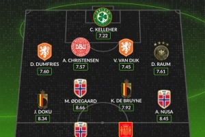 中場(chǎng):多庫(kù)(比利時(shí),8.34分)、厄德高(挪威,8.66分)、德布勞內(nèi)(比利時(shí),7.92分)、安東尼奧·努薩(挪威,8.45分)