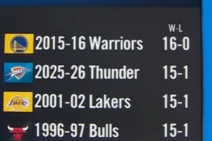 值得注意的是,過(guò)去30年開(kāi)賽季前16場(chǎng)至少15勝的衛(wèi)冕冠軍中,2001-02賽季的湖人(15勝1負(fù))和1996-97賽季的公牛(15勝1負(fù))都奪冠了。