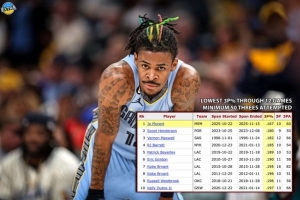 賽季至今,莫蘭特出戰(zhàn)12場,三分球60投10中,命中率只有16.7%,在NBA歷史上所有賽季前12場三分出手?jǐn)?shù)至少50次的球員中,這一命中率是最低的。
