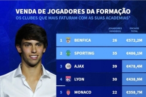 體育資訊11月21日訊 德國轉會市場統(tǒng)計了本世紀各俱樂部出售青訓球員的收入,并列出榜單,本菲卡、葡萄牙體育、阿賈克斯前三。