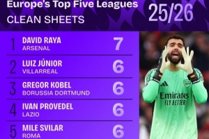 本賽季五大聯(lián)賽門將零封榜:拉亞7場,褲襪、諾伊爾、桑切斯在列