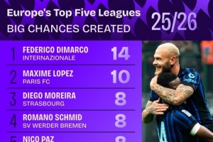 本賽季五大聯(lián)賽創(chuàng)造重大機會榜:迪馬爾科14次居首,帕斯8次第三