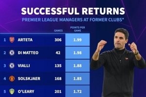 體育資訊11月21日訊 德國轉(zhuǎn)會市場統(tǒng)計了教練執(zhí)教球員時代英超老東家的場均積分,并列出榜單,阿爾特塔1.99分居首,迪馬特奧1.98分次席。