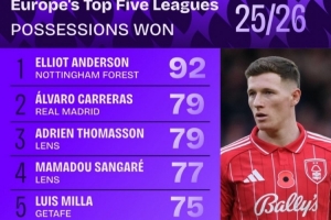 本賽季五大聯(lián)賽贏得球權(quán)榜:安德森居首,卡雷拉斯、莫德里奇在列