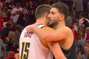 賽后,申京和約基奇擁抱寒暄。