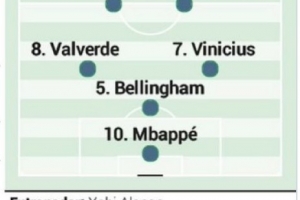 中場/邊鋒:居萊爾、卡馬文加、巴爾韋德、維尼修斯、貝林厄姆