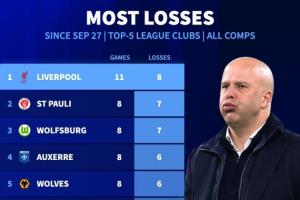 體育資訊11月24日訊 德轉(zhuǎn)統(tǒng)計(jì)了自9月27日以來五大聯(lián)賽球隊(duì)的輸球榜,利物浦以8場(chǎng)比賽高居榜單第一位。