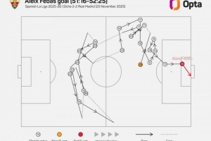 數(shù)據(jù)統(tǒng)計(jì)顯示,這粒進(jìn)球經(jīng)歷了22腳傳遞,是本賽季西甲第二多。