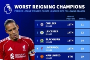 體育資訊11月24日訊 利物浦在本輪英超焦點(diǎn)戰(zhàn)主場(chǎng)0-3完敗諾丁漢森林,12輪聯(lián)賽后僅積18分,《轉(zhuǎn)會(huì)市場(chǎng)》統(tǒng)計(jì)顯示他們也是同期戰(zhàn)績(jī)第4差的英超衛(wèi)冕冠軍。