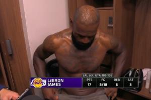 賽后,詹姆斯在更衣室接受采訪時僅用一條毛巾遮住重要部位,并不時調(diào)整。