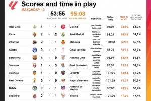 西甲第13輪凈時間:埃爾切vs皇馬58分8秒,巴薩vs畢巴53分44秒