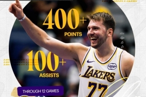 此役過后,東契奇本賽季出戰(zhàn)12場已達成400分100助,成為歷史上單賽季達此數(shù)據(jù)最快的球員。
