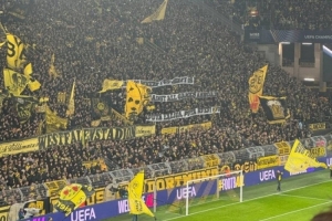 體育資訊11月26日訊 今天凌晨,多特在歐冠大勝比利亞雷亞爾,多特球迷在比賽中拉起橫幅,與比利亞雷亞爾球迷一同反對(duì)西甲海外賽。