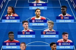 中場(chǎng)/邊鋒:賴(lài)斯(2025年1.2億歐)、厄德高(2024年1.1億歐)、奧利塞(2025年1.3億歐)、穆西亞拉(2025年1.4億歐)、薩卡(2024年1.5億歐)