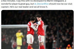 阿森納擁躉摩根在社媒曬出賴斯本場(chǎng)戴上隊(duì)長(zhǎng)袖標(biāo)的照片,寫道:“賴斯昨晚比賽中首次戴上阿森納隊(duì)長(zhǎng)袖標(biāo),盡管只有幾分鐘。我這么說(shuō)并不是出于對(duì)厄德高的不敬,他也是一名出色的球員、很棒的伙計(jì),但是賴斯現(xiàn)在應(yīng)該成為球隊(duì)隊(duì)長(zhǎng)了,他是我們真正的領(lǐng)袖,這我們都知道的?!?/p>