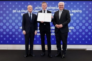在伯納烏榮譽(yù)包廂舉行的儀式上,克羅斯被授予德國功績勛章騎士十字勛章。德國總統(tǒng)施泰因邁爾親自為這位皇馬傳奇和世界足壇巨星頒發(fā)了這一榮譽(yù)。出席授勛儀式的還有皇馬名譽(yù)主席何塞·馬丁內(nèi)斯·皮里、機(jī)構(gòu)關(guān)系總監(jiān)布特拉格諾、主帥阿隆索、球員巴爾韋德、呂迪格,以及皇馬傳奇球員羅伯托·卡洛斯、阿韋羅亞和索拉里。
