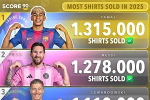 體育資訊11月28日訊 Score 90統(tǒng)計了2025年截至目前世界足壇的球員球衣銷量榜,亞馬爾以131.5萬件排名第一,梅西第二,C羅位列第七。